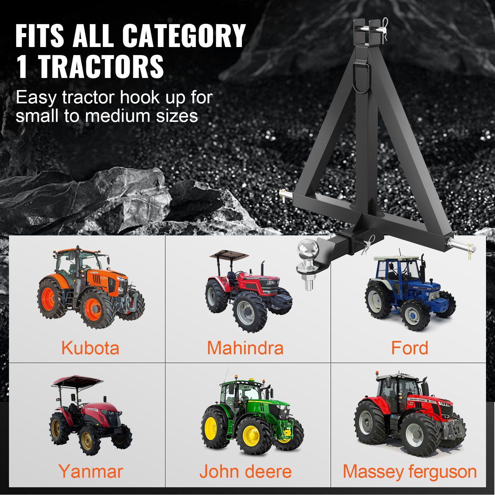 VEVOR's brand new 3 point quick hitch category 1 is designed for swift connection with all category 1 tractors like Kubota, BX, LM25H, etc. Its surface is powder-coated to resist corrosion, making it perfect for outdoor use. This hitch receiver is your trusted partner for any heavy-duty challenge.