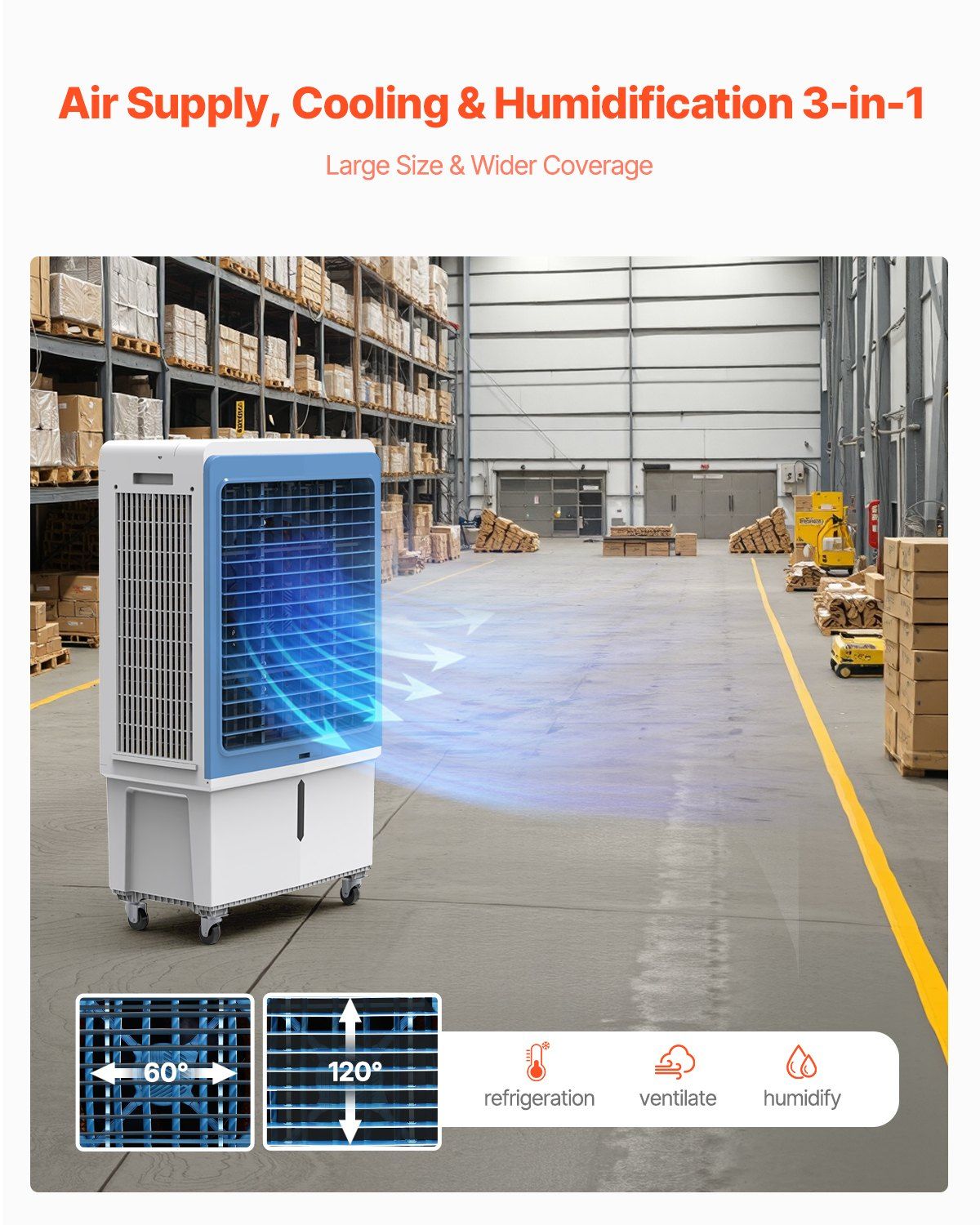 · Humidifying, Airflow & Cooling 3-in-1: Our evaporative air cooler delivers an airflow of up to 4129 CFM, quickly cooling and refreshing the air. When you need quick cooling in hot weather, place the ice boxes (refrigerated for 4 hours) in the water tank for optimal cooling. 60° horizontal and 120° vertical wide-angle oscillation ensures a cool and comfortable experience in dry outdoor or open indoor environments.