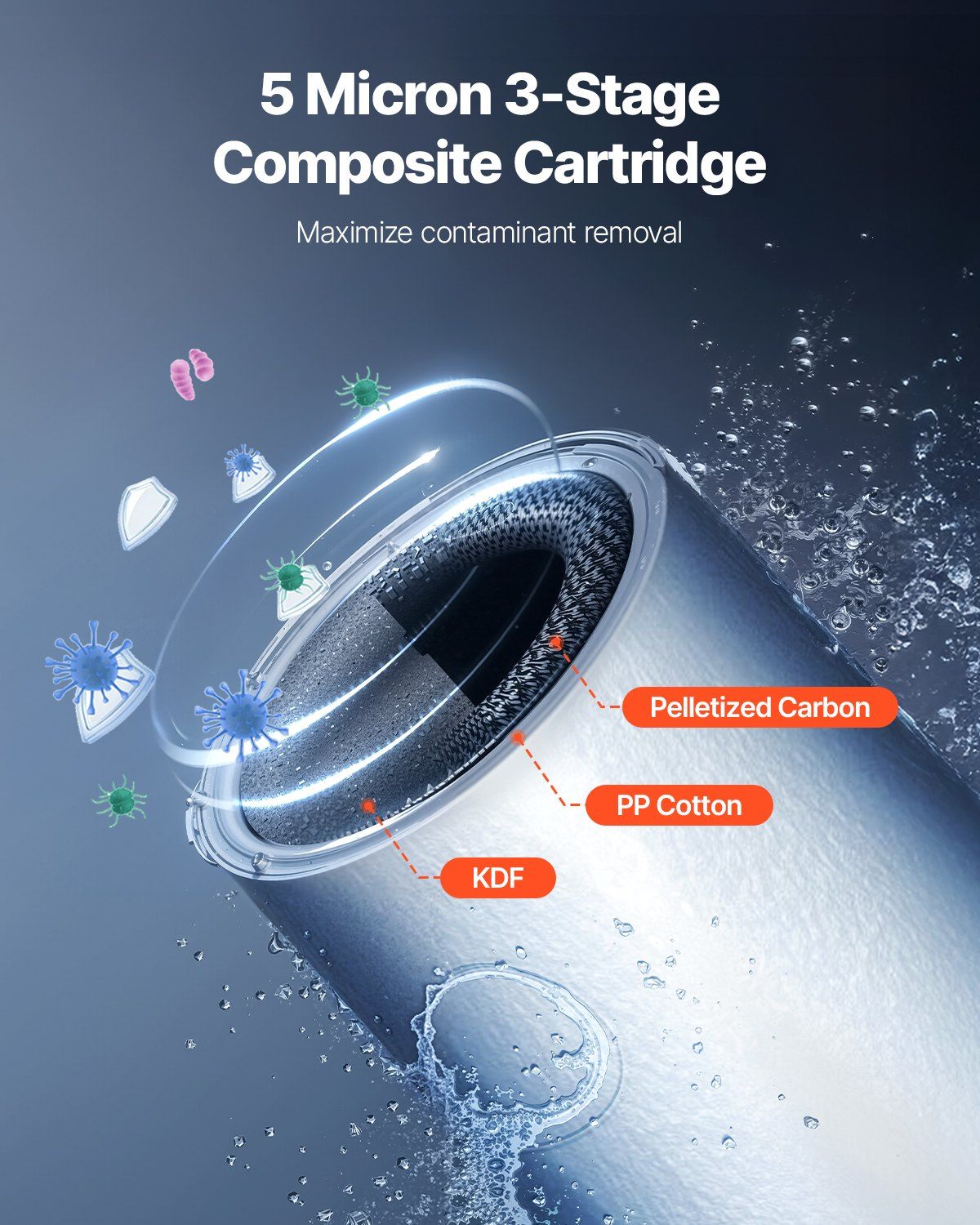 2.Extended Lifespan: The RV filter system uses a 2.5 x 10 in filter cartridge, with a filtration flow rate of 2.9 GPM, capable of filtering 8,000 gallons of water without clogging. Ensures the cartridge maintains purification accuracy without overloading. To replace the cartridge, use the included wrench to remove the filter housing