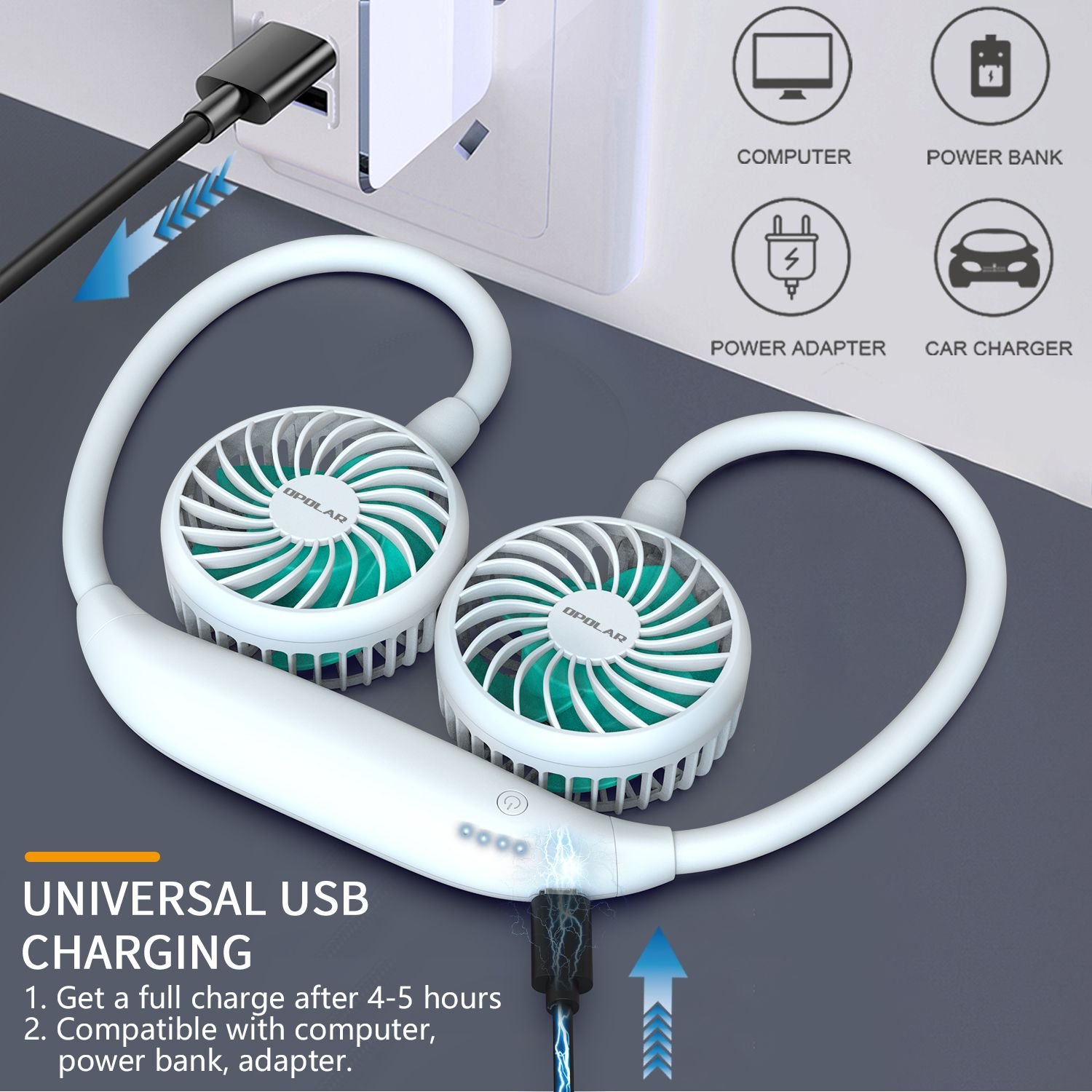 6 Speed Adjustable: Our neck fan supports 6-speed adjustment. You can adjust any wind speed to achieve your most comfortable state. The first speed is the natural wind, just as comfortable as the natural wind blowing gently on you. The other five wind speeds from low to high will blow you away from the summer heat.Durable Battery Life: Built-in high-quality 2600mAh rechargeable battery, working time up to 16 hours in natural wind mode. It can be used for 2-5.5 hours under strong wind to meet your different needs on different occasions. Comes with a USB charging cable, you can charge it by power bank, PC/laptop, phone charger etc.Hands-free & Wearable: You only need to hang it around your neck to keep it cool, no need to hold a heavy hand-held fan frequently. It is an ideal choice for outdoor activities and outdoor travel. It is very suitable for watching sports, mountain climbing, hiking, as well as construction workers, gardeners and farmers.360°Rotation: You can flexibly adjust the angle of the two fans by 360° to achieve the best use effect. Fordable and flexible arms with ergonomic neckband, the portable necklace fan suits all necks, absolutely free your hands while blowing away the heat.Lightweight And Low Noise: Ultra-quiet motor, quiet wind. The hands-free personal fan is made of environmentally friendly ABS and PP, which is light, quiet and durable, and will not hurt your neck even if you wear it for a long time. Note: Please tie up your hair to avoid it wraps around the blades.