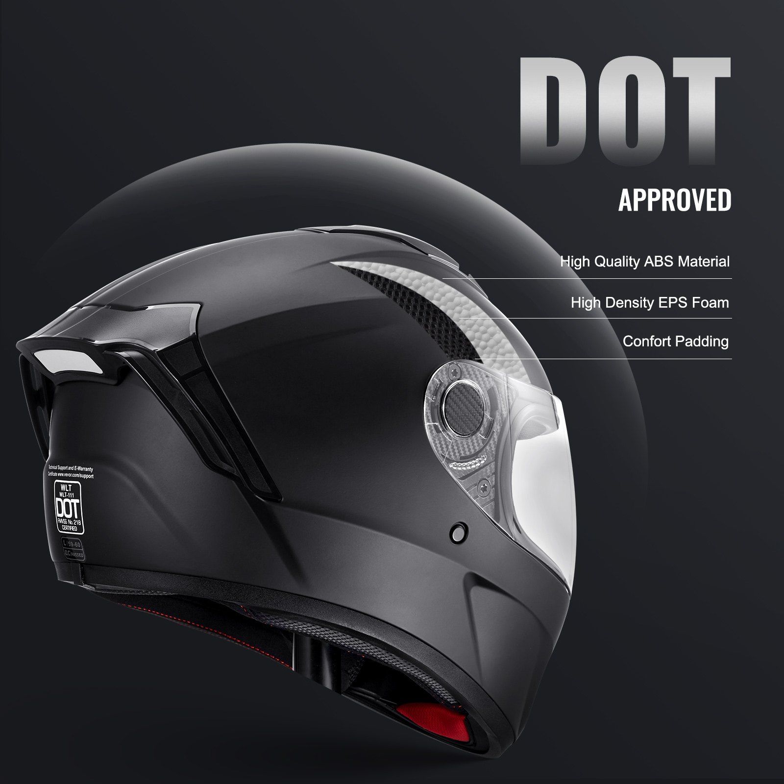 1.DOT Approved & Sturdy: This motorcycle helmet is DOT certified and meets the US regulatory requirements. Its sturdy ABS shell combined with soft EPS foam and skin-friendly lining provides all-around safeguard for your head.