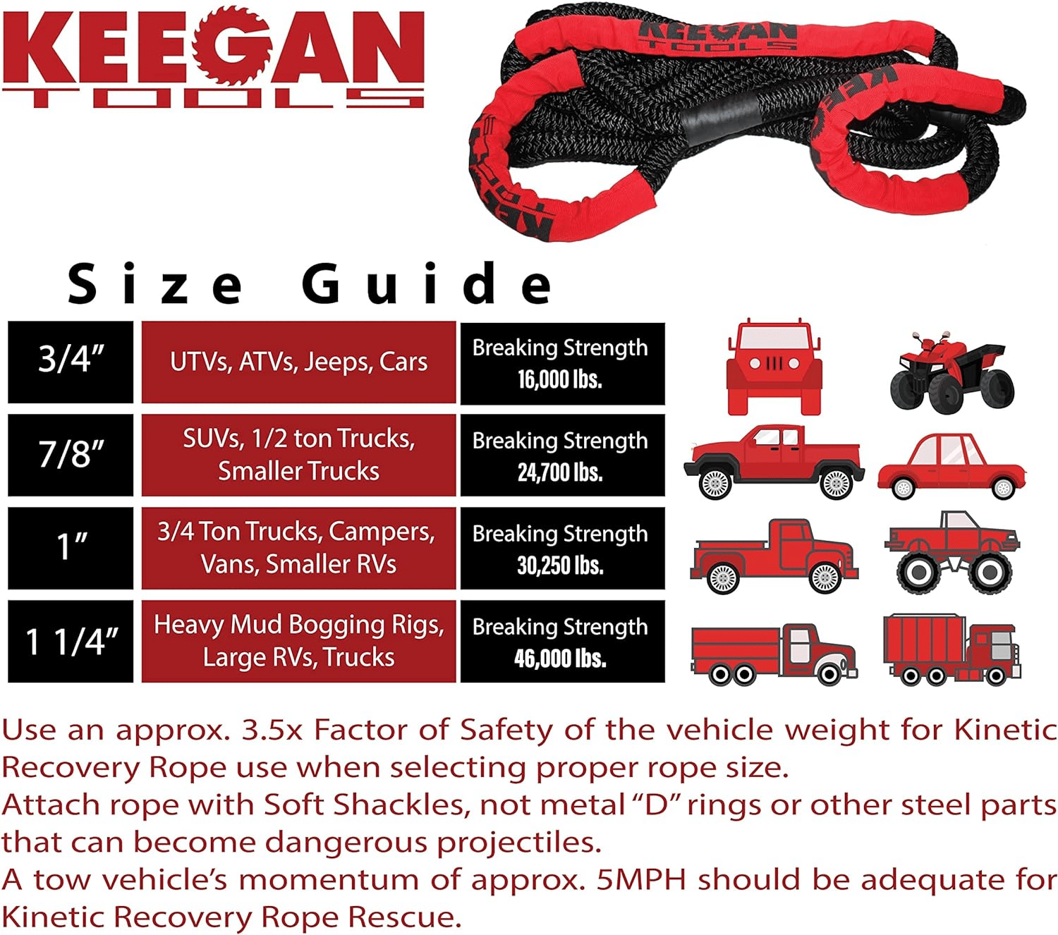 Do it once. Do it right You need carefully developed tools to get it done. Tools that feel good in your hands. Tools that last. Tools that you can depend on to help you complete your mission. Jerk No More! No More Vehicle Damage! Replace your dated, inferior, rigid snatch straps, tow chains with a Kinetic Energy Recovery Rope that will smoothly rescue your rig or your friend s rig. No more violent jerking. Harness the logic of physics instead of fighting it. Use your rescue vehicles momentum to get UNSTUCK Faster, Smarter and Safer. Super StretchIt Stretches Big Time, up to 30% in length! NO MORE BENT, TWISTED, DAMAGED BUMPERS Caused by Sudden Jerks from non-kinetic straps and chains. MaterialsMade from pure, premium double braided nylon 66 with the ability to stretch up to 30% in length. Attach Kinetic Recovery Ropes with Soft Shackles, not metal D rings or other steel parts that can become dangerous projectiles. A tow vehicle s momentum of approx. 5 MPH should be adequate for Kinetic Recovery Rope Rescue. Rescue & RecoveryYou won t believe Kinetic Recovery Ropes Ease of Use, Low Recoil, No Whiplash, No Sudden Jerk Performance when rescuing ATV s, Trucks, Cars, Snowmobiles, SUV s, 4X4 s, Marine Craft, Boats, etc. When you have an appropriately sized KEEGAN TOOLS kinetic rope in your everyday emergency carry kit you can proceed with certainty knowing you've got the best recovery rope.